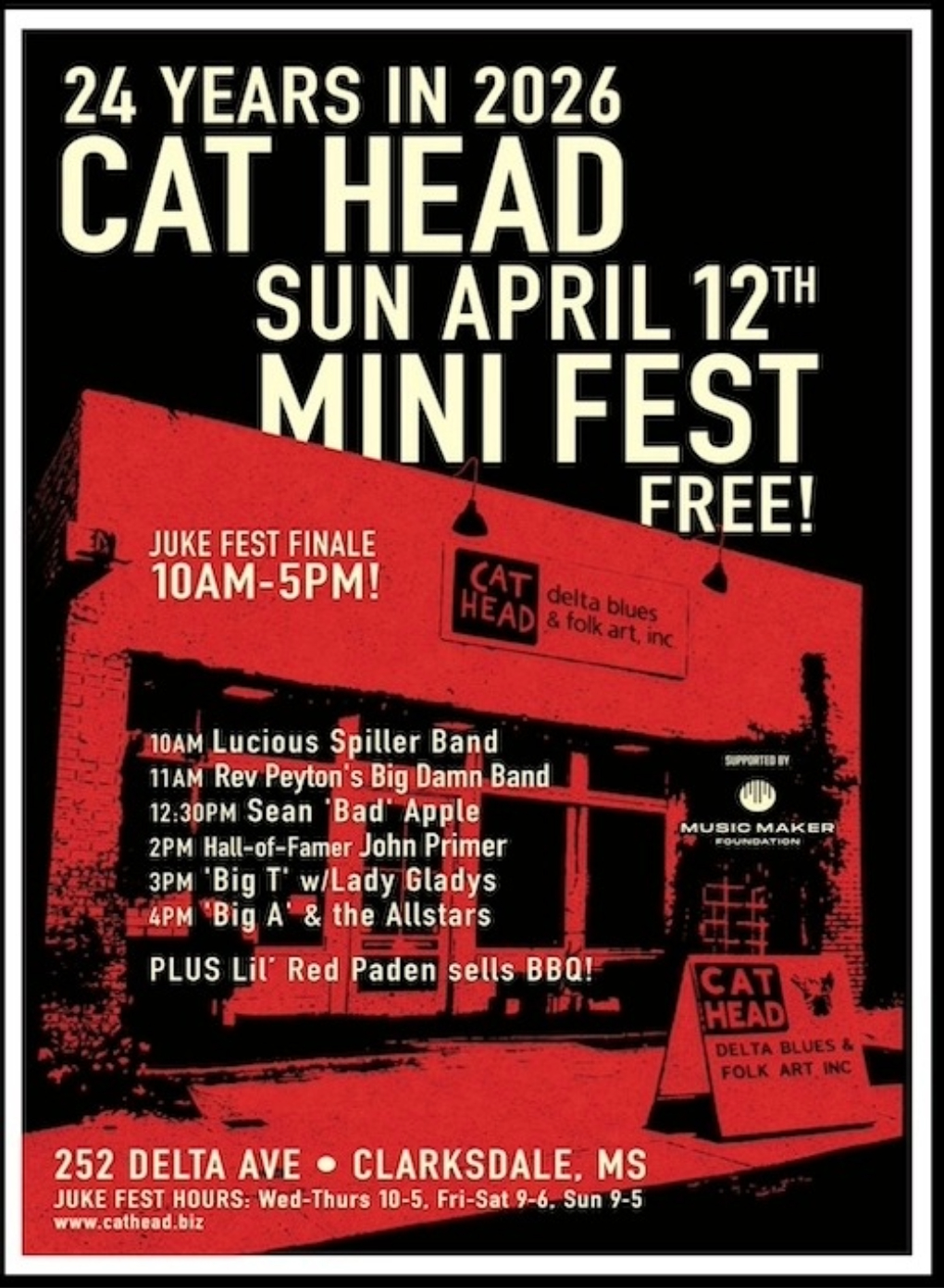 Wrap up another exciting Juke Joint Festival at Cat Head Delta Blues & Folk Art in Clarksdale, MS! This spring’s Cat Head Mini Blues Fest lineup includes: