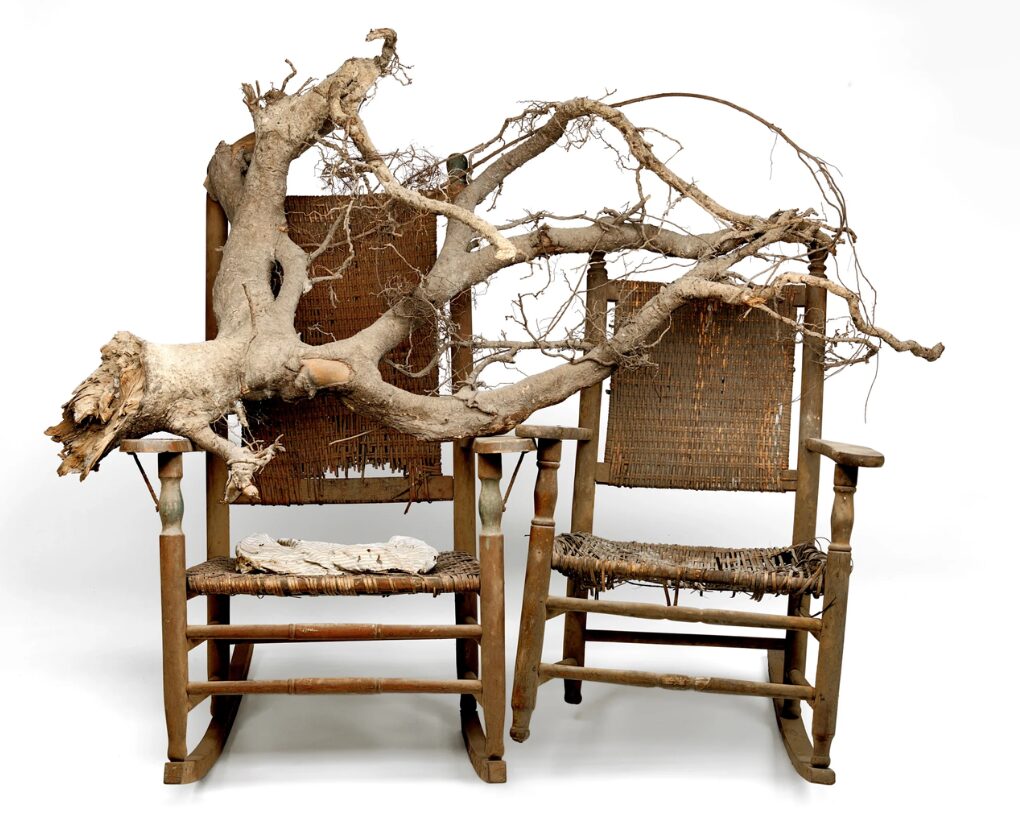 There is an inviting warmth to many of Holley’s creations. But viewers drawn in by the calm muted earth tones and surface-level folksiness will also find themselves directly challenged. In Him and Her Hold the Root, for example, a giant gnarled tree root sits atop two ragged rocking chairs, a larger one and a smaller one.