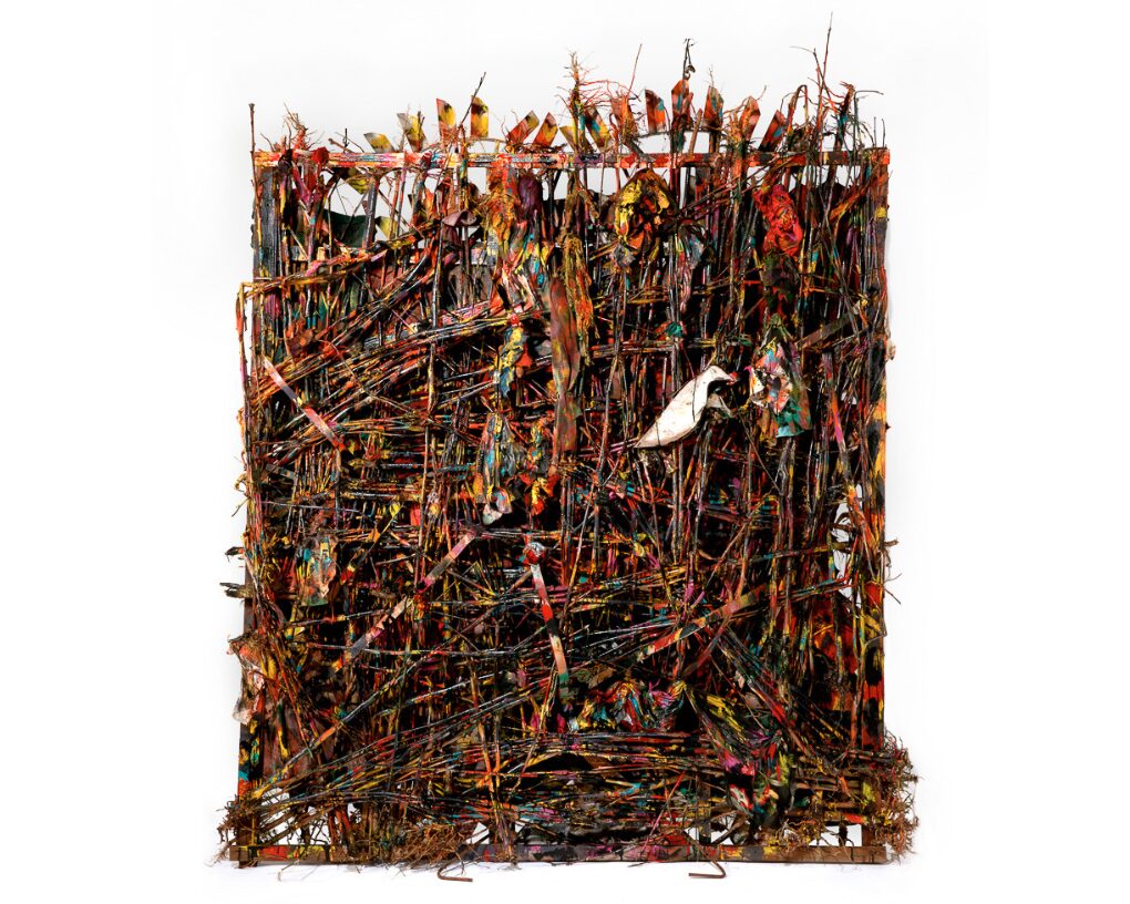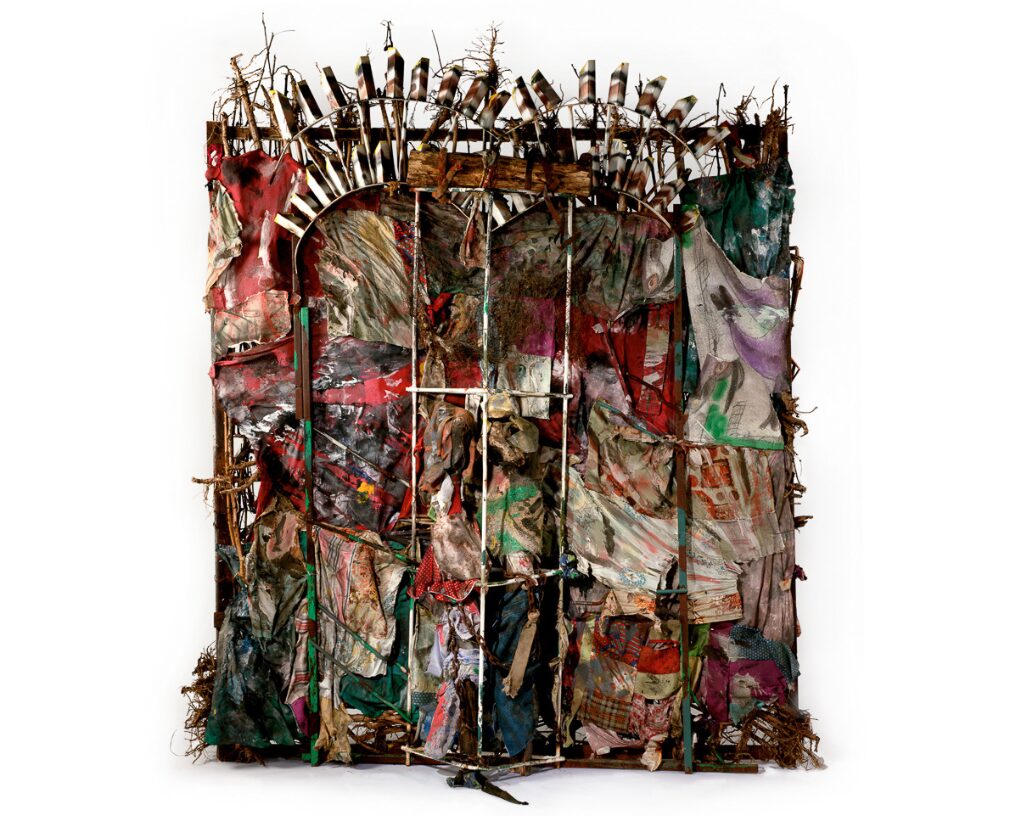 Like Freeman Vines’ work with the hanging tree, Dial’s art is deeply intertwined with the raw materials he uses to make it. His piece History Refused to Die is an eight-and-a-half-foot tall assemblage of clothing, collaged drawings, tin, wire, steel, Masonite, steel chain, enamel, and spray paint. This is all densely interwoven with the stalks and roots of okra plants, creating a kind of altar of astonishing color, texture, and complexity. “The plant serves as a metaphor for the shared history—the ‘roots’—of people whose personal genealogies tie back to Africa,” reads the Metropolitan Museum of Art’s description of the work. “Widely associated with Southern cuisine, okra is indigenous to Africa and, like many other foodstuffs, came to the Americas via the international slave trade.” Dial’s work shows the union of African and African American; the layers of culture that black people kept alive despite their oppressor’s attempts to destroy it. Looking at the assemblage from the back, a solitary white dove is perched in the darkly colored okras stalks. The overall effect is to draw the viewer into a transformational place where opposing forces coexist; a place that is both dark and hopeful, earthly and spiritual, full of gravity and lightness.