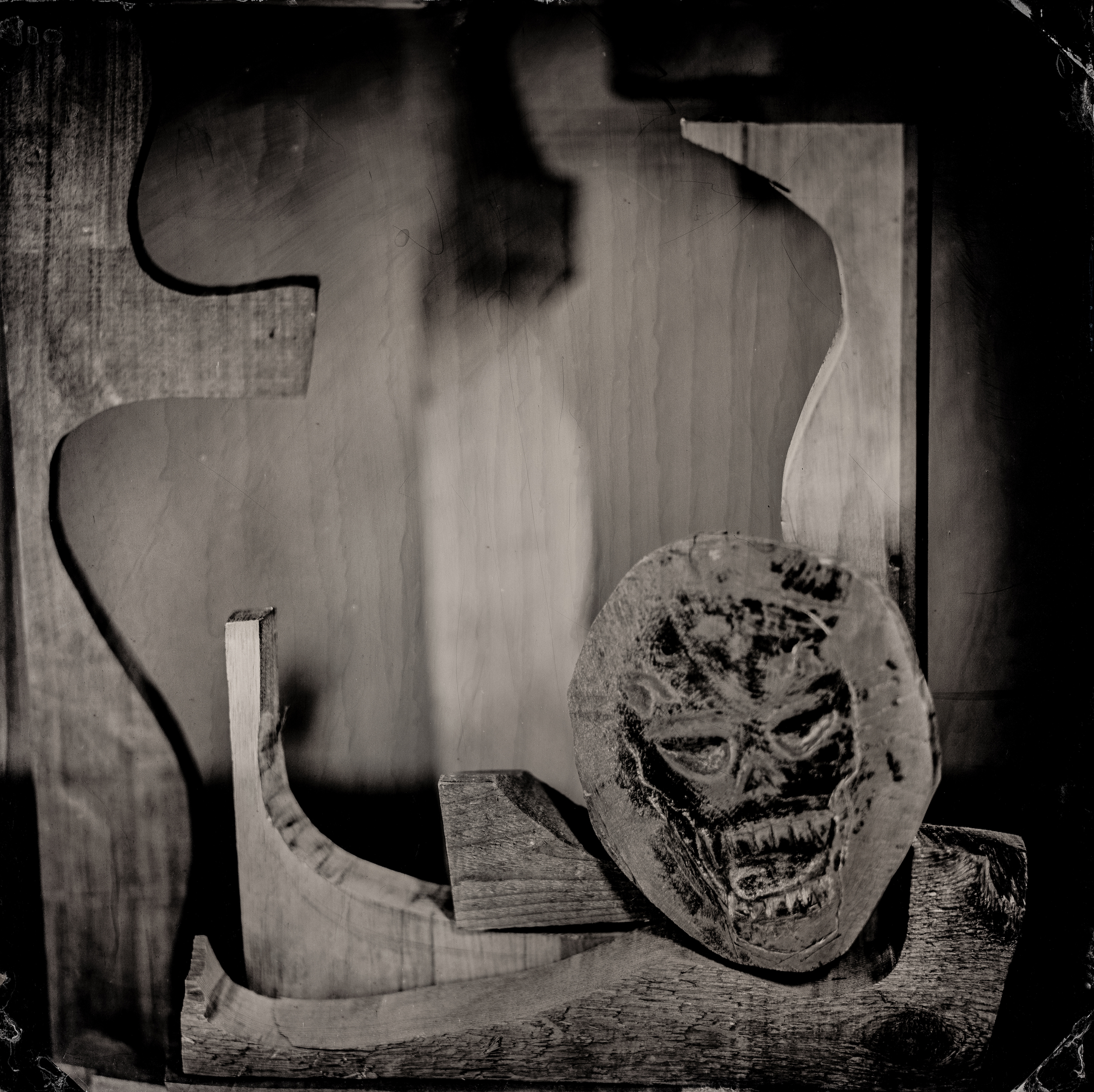 When Freeman Vines began working with the hanging tree wood and learning the story of Oliver Moore, he turned his unique sense of hearing toward the silences of the past. Dark skeletal faces and creeping black snakes began to emerge from the wood as he carved. Some of these carvings took the form of guitars, but these were not musical instruments in the traditional sense.